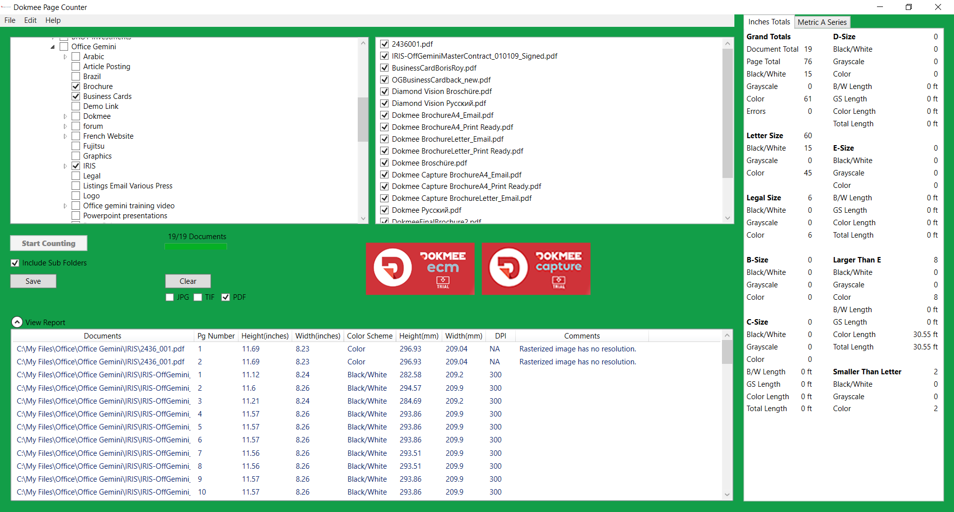 Dokmee Page Counter est une application facile à utiliser pour le comptage et la mesure de pages au format TIFF, PDF et JPEG. Il prend en charge toutes les versions de fichiers TIFF et PDF à page unique et à pages multiples, ainsi que les fichiers JPEG à page unique. Traitez rapidement et efficacement de grands groupes d'images et de dossiers en même temps pour analyser le nombre de pages, la taille de la page et le type de compression. Créez facilement des rapports au format Excel dans les systèmes de mesure métriques et impériaux.